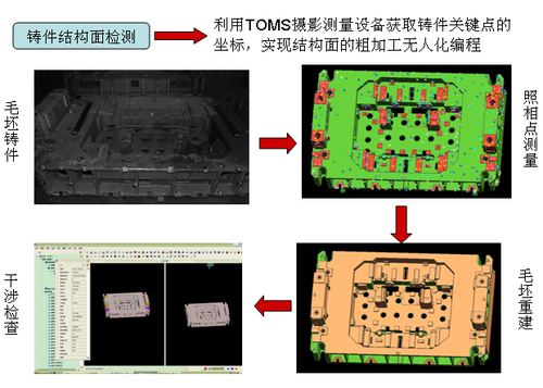 結構面編程完全依據CAD提供的實體,而機械車間調用編程者提供的程序加工的對象是鑄件,在最理想的狀態下,鑄件與實體之間的差別是:在非加工面上鑄件比實體大或小2~5mm,在加工面上鑄件比實體大10~15mm,但在現實狀態下,因受到鑄造前和鑄造時很多因素的影響,鑄件與實體間的差別極不穩定,有時會差很多,按照以前的方法必須編檢測程序,還會造成空走刀的情況,如果非加工面變型大還會對機床造成損傷,如果使用TOMS攝影測量系統會測量出鑄件真實的情況,然后按照測量結果更改程序,減少檢測程序的編制、提前發現鑄件問題做出補救預案、減少空走刀、減輕機床的負載、減少刀具磨損、預防撞刀等。