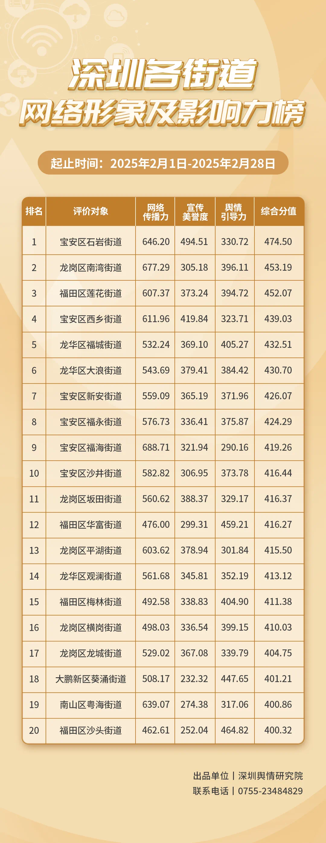 2025年2月,各街道聚焦網絡形象建設效能提升,持續擴大基層影響力。《深圳各街道網絡形象及影響力榜》(2月榜單)評估街道在網絡空間的綜合表現,為基層網絡形象治理提供參考。本期榜單數據統計范圍為2025年2月1日至2月28日。