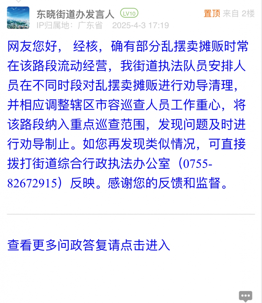 網友您好,經核,確有部分亂擺賣攤販時常在該路段流動經營,我街道執法隊員安排人員在不同時段對亂擺賣攤販進行勸導清理,并相應調整轄區市容巡查人員工作重心,將該路段納入重點巡查范圍,發現問題及時進行勸導制止。如您再發現類似情況,可直接撥打街道綜合行政執法辦公室(0755-82672915)反映。感謝您的反饋和監督。