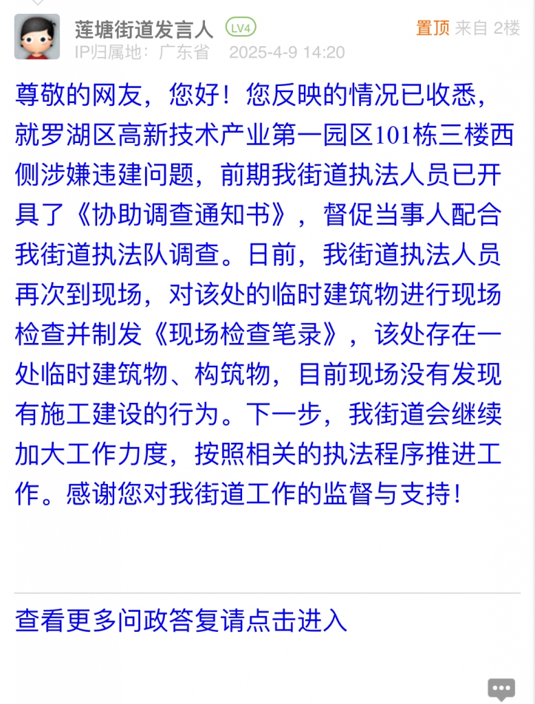 尊敬的網友,您好!您反映的情況已收悉,就羅湖區高新技術產業第一園區101棟三樓西側涉嫌違建問題,前期我街道執法人員已開具了《協助調查通知書》,督促當事人配合我街道執法隊調查。日前,我街道執法人員再次到現場,對該處的臨時建筑物進行現場檢查并制發《現場檢查筆錄》,該處存在一處臨時建筑物、構筑物,目前現場沒有發現有施工建設的行為。下一步,我街道會繼續加大工作力度,按照相關的執法程序推進工作。感謝您對我街道工作的監督與支持!
