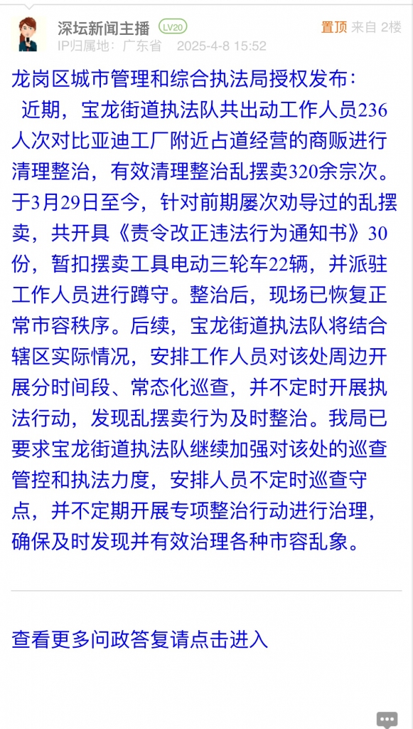 近期,寶龍街道執法隊共出動工作人員236人次對比亞迪工廠附近占道經營的商販進行清理整治,有效清理整治亂擺賣320余宗次。于3月29日至今,針對前期屢次勸導過的亂擺賣,共開具《責令改正違法行為通知書》30份,暫扣擺賣工具電動三輪車22輛,并派駐工作人員進行蹲守。整治后,現場已恢復正常市容秩序。后續,寶龍街道執法隊將結合轄區實際情況,安排工作人員對該處周邊開展分時間段、常態化巡查,并不定時開展執法行動,發現亂擺賣行為及時整治。我局已要求寶龍街道執法隊繼續加強對該處的巡查管控和執法力度,安排人員不定時巡查守點,并不定期開展專項整治行動進行治理,確保及時發現并有效治理各種市容亂象。