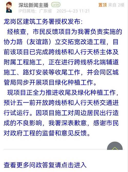 經核查,市民反饋項目為我署負責實施的協力路(友誼路)立交拓寬改造工程,目前該項目已完成跨線橋和人行天橋主體及附屬工程施工,正在進行跨線橋北端輔道施工、路燈安裝等收尾工作,并會同區城管局同步開展項目綠化種植工作。現項目正全力推進收尾及綠化種植工作,預計五一前開放跨線橋和人行天橋交通進行試運行。因項目施工對周邊居民出行造成的不良影響,我署深表歉意,感謝市民對政府工程的監督和意見反饋。