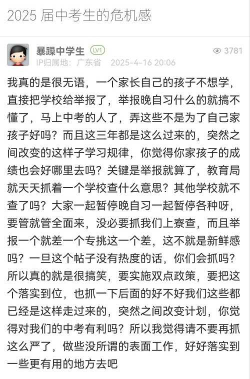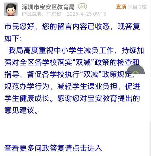 市民您好,您的留言內容已收悉,現答復如下:我局高度重視中小學生減負工作,持續加強對全區各學校落實“雙減”政策的檢查和指導,督促各學校執行“雙減”政策規定,規范辦學行為,減輕學生課業負擔,促進學生健康成長。感謝您對寶安教育提出的意見建議。
