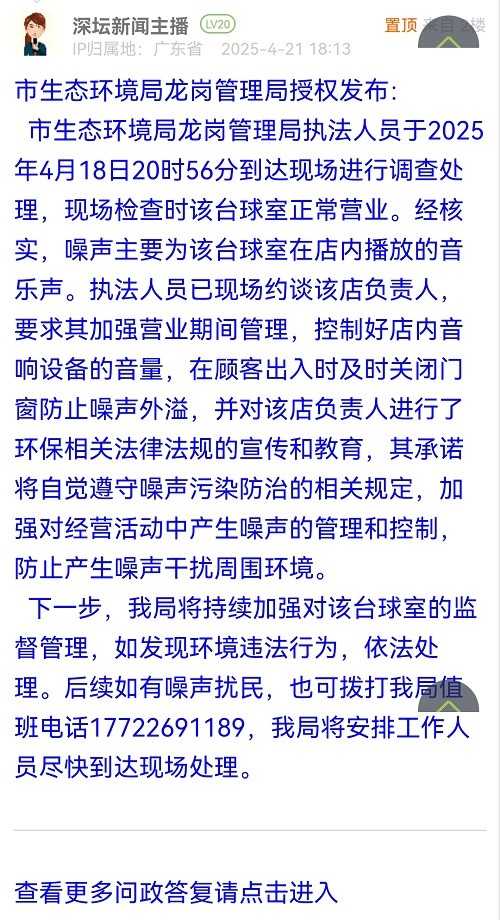 市生態環境局龍崗管理局執法人員于2025年4月18日20時56分到達現場進行調查處理,現場檢查時該臺球室正常營業。經核實,噪聲主要為該臺球室在店內播放的音樂聲。執法人員已現場約談該店負責人,要求其加強營業期間管理,控制好店內音響設備的音量,在顧客出入時及時關閉門窗防止噪聲外溢,并對該店負責人進行了環保相關法律法規的宣傳和教育,其承諾將自覺遵守噪聲污染防治的相關規定,加強對經營活動中產生噪聲的管理和控制,防止產生噪聲干擾周圍環境。下一步,我局將持續加強對該臺球室的監督管理,如發現環境違法行為,依法處理。后續如有噪聲擾民,也可撥打我局值班電話17722691189,我局將安排工作人員盡快到達現場處理。