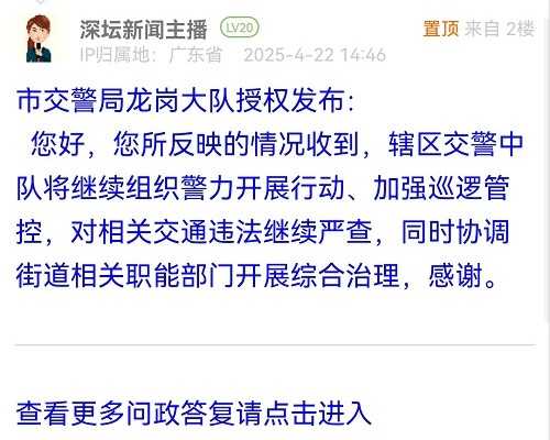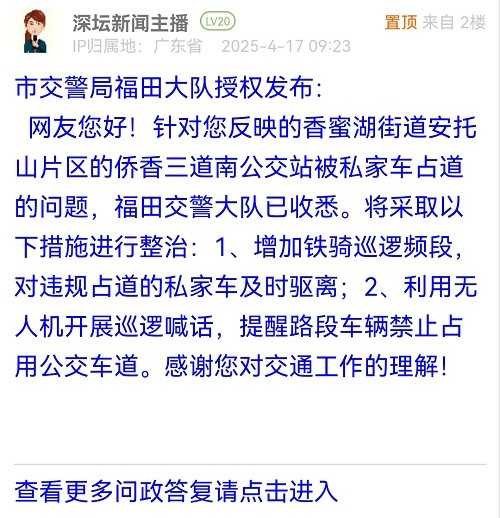 據統計,2025年4月14日-2025年4月20日,網友在深圳論壇發布問政類帖文共35篇,得到相關單位正式回應的帖文數為31篇,本期簡報回應速度最快的單位:市交警局羅湖大隊、羅湖區蓮塘街道辦事處。