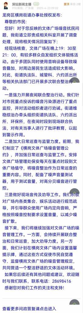 接下來,我們將繼續加強對文體廣場的噪音管理工作。一方面,會持續開展聯合整治和日常巡查,加大勸導力度。另一方面,我們計劃在橫崗文體廣場內設置溫馨提示牌,通過這些方式促使市民自覺遵守、監督橫崗文體廣場的噪音管理規定,共同營造一個整潔舒適的文體活動環境。
