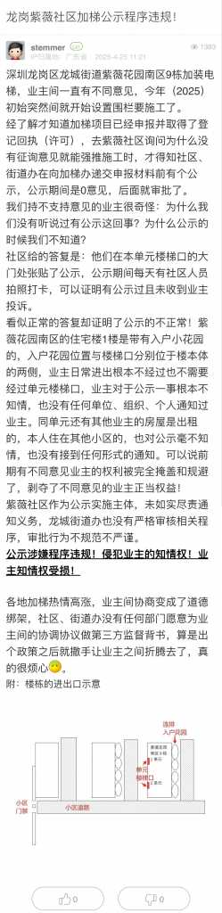 根據《深圳市既有住宅加裝電梯聯合審查和專項聯合驗收工作指引》、《龍崗區既有住宅加裝電梯建設工作指引(修訂稿)》等相關法規政策規定,龍崗區既有住宅電梯加裝工作開展,堅持“業主自愿、政府引導、多元參與、共同推進”的原則,明確業主主體責任,由本樓棟或單元業主自愿發起、自主協商、自行建設、自治管養。各小區申請加梯由具備既有住宅加裝電梯條件單元的業主代表通過線上或者線下自行開展本單元加裝電梯意愿征集,在滿足申報條件后,業主代表或其委托機構向社區工作站提交辦理既有住宅加裝電梯聯合審查的相關資料,社區工作站對單元業主同意加裝電梯比例是否達到法定比例和申報材料是否齊全進行初審,街道進行復核,復核無誤后,在加裝電梯單元樓道口等明顯位置進行公示,在公示期間,利害關系人有不同意見的,可向社區工作站提交書面意見。公示期滿后可提交區加梯辦進入聯合審查,其聯合審查部門為龍崗區住建局、龍崗區規自局、龍崗區市場監督局。經核查, 此單元加梯項目,公示時間是2024年10月25日至2024年11月8日,公示期間未收到本單元業主提交的書面反對意見。針對業主自愿發起的加梯項目,存在利害關系人有不同意見的民事糾紛問題,建議雙方業主友好自行協商。若溝通不暢,可向社區人民調解委員會申請搭建平臺組織協商或也可以通過司法途徑維護自身權益。