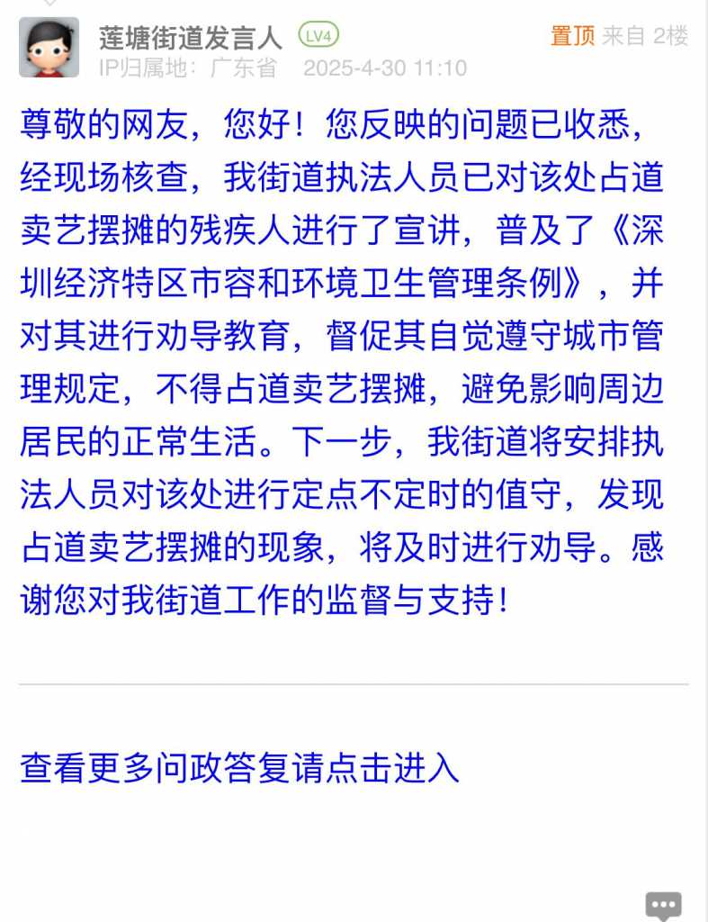 尊敬的網友,您好!您反映的問題已收悉,經現場核查,我街道執法人員已對該處占道賣藝擺攤的殘疾人進行了宣講,普及了《深圳經濟特區市容和環境衛生管理條例》,并對其進行勸導教育,督促其自覺遵守城市管理規定,不得占道賣藝擺攤,避免影響周邊居民的正常生活。下一步,我街道將安排執法人員對該處進行定點不定時的值守,發現占道賣藝擺攤的現象,將及時進行勸導。感謝您對我街道工作的監督與支持!