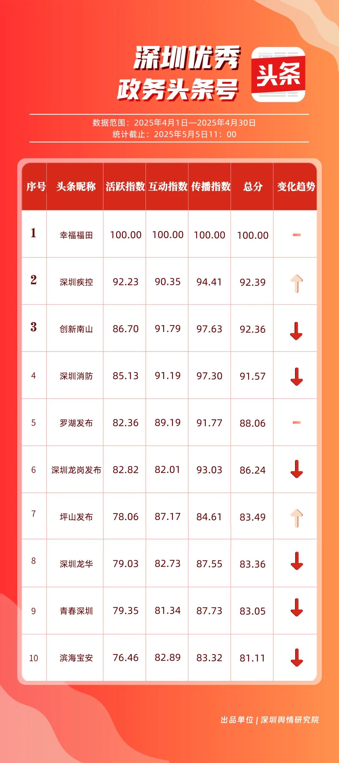 4月,“幸福福田”“深圳疾控”“創新南山”“深圳消防”“羅湖發布”“深圳龍崗發布”“坪山發布”“深圳龍華”“青春深圳”“濱海寶安”共10個政務頭條號入選“優秀政務頭條號”榜單。“幸福福田”延續上月的優異表現,以優質的內容輸出和穩定的用戶互動,位列榜單首位,成為政務頭條號的標桿;“深圳疾控”則以92.39分的亮眼成績排在榜單第二位,凸顯了政務新媒體在公共衛生領域的傳播成果;“創新南山”“深圳消防”“羅湖發布”緊隨其后,分別在城區形象宣傳、消防安全領域等方面深耕細作,持續擴大政務信息的覆蓋面與影響力。