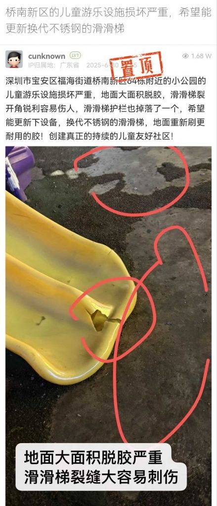 您好!感謝您反映的橋南新區兒童游樂設施損壞嚴重、希望更新不銹鋼滑滑梯等問題,福海街道高度重視兒童安全,立即組織相關部門開展核實工作。現將有關情況回復如下: