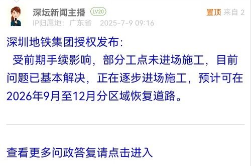 受前期手續影響,部分工點未進場施工,目前問題已基本解決,正在逐步進場施工,預計可在2026年9月至12月分區域恢復道路。