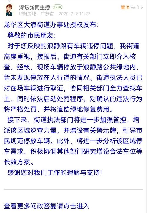 對于您反映的浪靜路有車輛違停問題,我街道高度重視,接報后,街道有關部門立即介入核查,經核,現場車輛停放于浪靜路公共綠地內,暫未發現停放在人行道的情況。街道執法人員已對在場車輛進行取證,協同相關部門全力查找車主,同時依法啟動處罰程序,對確認的違法行為將嚴格處罰,并將追償綠地修復費用。