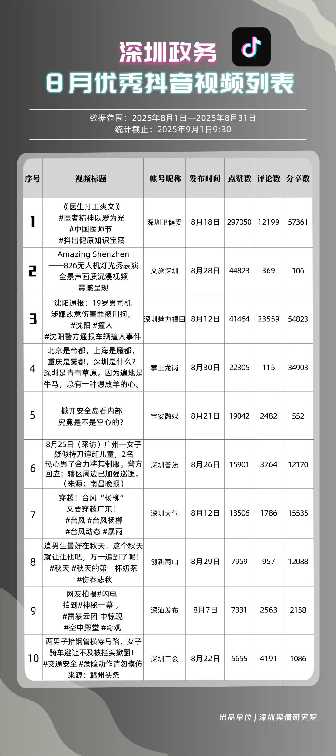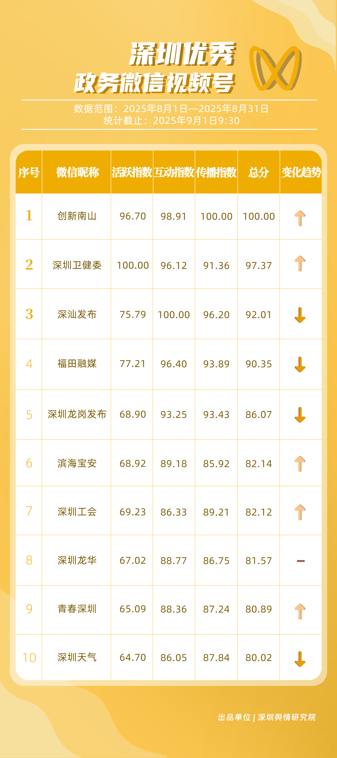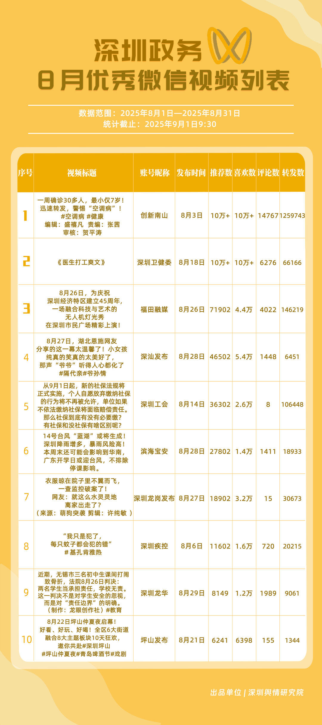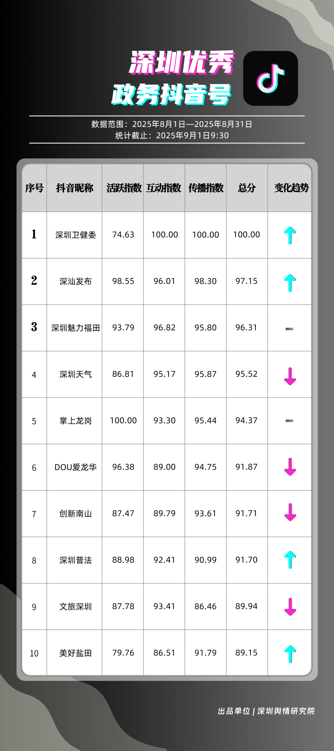 8月,“深(shen)(shen)(shen)圳(zhen)(zhen)(zhen)衛健委(wei)”“深(shen)(shen)(shen)汕發(fa)布”“深(shen)(shen)(shen)圳(zhen)(zhen)(zhen)魅力福(fu)田”“深(shen)(shen)(shen)圳(zhen)(zhen)(zhen)天氣(qi)”“掌上(shang)(shang)(shang)龍崗”“DOU愛龍華”“創(chuang)新南(nan)山”“深(shen)(shen)(shen)圳(zhen)(zhen)(zhen)普法”“文旅深(shen)(shen)(shen)圳(zhen)(zhen)(zhen)”“美好鹽(yan)田”共10個(ge)政務抖音(yin)號(hao)獲得(de)“優(you)秀(xiu)(xiu)政務抖音(yin)號(hao)”稱號(hao)。“深(shen)(shen)(shen)圳(zhen)(zhen)(zhen)衛健委(wei)”內容(rong)吸引大量(liang)網(wang)民關(guan)注(zhu),4條視頻累計獲得(de)超50萬次(ci)點(dian)(dian)贊,排(pai)名(ming)(ming)從上(shang)(shang)(shang)期的(de)第(di)九名(ming)(ming)上(shang)(shang)(shang)升(sheng)至第(di)一(yi)名(ming)(ming);“深(shen)(shen)(shen)汕發(fa)布”憑借較(jiao)高(gao)的(de)傳(chuan)播(bo)指數評分(fen),位列第(di)二名(ming)(ming),排(pai)名(ming)(ming)有所(suo)上(shang)(shang)(shang)升(sheng)。“深(shen)(shen)(shen)圳(zhen)(zhen)(zhen)魅力福(fu)田”“深(shen)(shen)(shen)圳(zhen)(zhen)(zhen)天氣(qi)”等賬號(hao)緊隨其后(hou),得(de)分(fen)均在95分(fen)左右。上(shang)(shang)(shang)榜(bang)的(de)優(you)秀(xiu)(xiu)政務抖音(yin)號(hao)深(shen)(shen)(shen)耕優(you)質創(chuang)作,精準把握網(wang)民興趣點(dian)(dian),使作品收獲高(gao)點(dian)(dian)贊、高(gao)轉發(fa),推動評論區(qu)形成良(liang)性互動氛圍,以(yi)優(you)秀(xiu)(xiu)內容(rong)提(ti)升(sheng)政務傳(chuan)播(bo)效能。