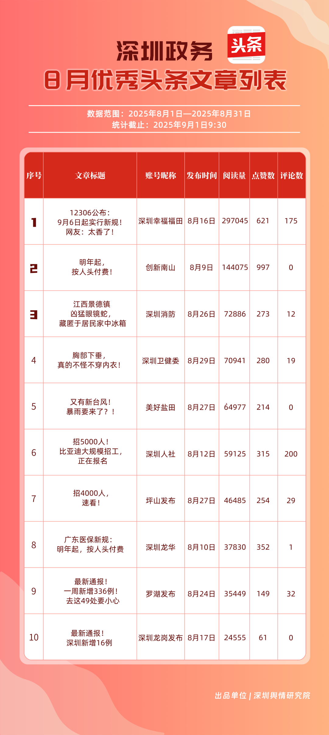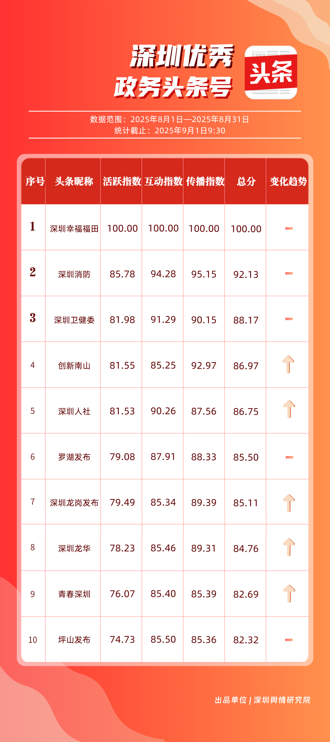 8月,“深圳幸福福田”“深圳消防(fang)”“深圳衛健委(wei)”“創(chuang)新(xin)南山(shan)”“深圳人社”“羅湖發布(bu)”“深圳龍崗發布(bu)”“深圳龍華”“青春深圳”“坪山(shan)發布(bu)”共10個政務(wu)(wu)頭條號(hao)入(ru)選“優秀政務(wu)(wu)頭條號(hao)”榜單。“深圳幸福福田”憑借持(chi)續優異(yi)的(de)(de)綜(zong)合表(biao)(biao)現,以(yi)滿分成績(ji)穩(wen)居榜單首位,彰(zhang)顯出強大的(de)(de)政務(wu)(wu)傳播力與影響力;“深圳消防(fang)”“深圳衛健委(wei)”則以(yi)穩(wen)定的(de)(de)內容質量與深厚的(de)(de)民眾基礎(chu),持(chi)續為市民提供權威、及(ji)時的(de)(de)服務(wu)(wu)信息,排名穩(wen)固。“創(chuang)新(xin)南山(shan)”“深圳人社”等上榜賬號(hao)亦表(biao)(biao)現亮(liang)眼(yan),聚焦民生服務(wu)(wu)傳遞政策溫(wen)度,共同構成政務(wu)(wu)新(xin)媒體矩(ju)陣(zhen)的(de)(de)中堅力量,為城市治理與民生服務(wu)(wu)注(zhu)入(ru)鮮(xian)活動能。