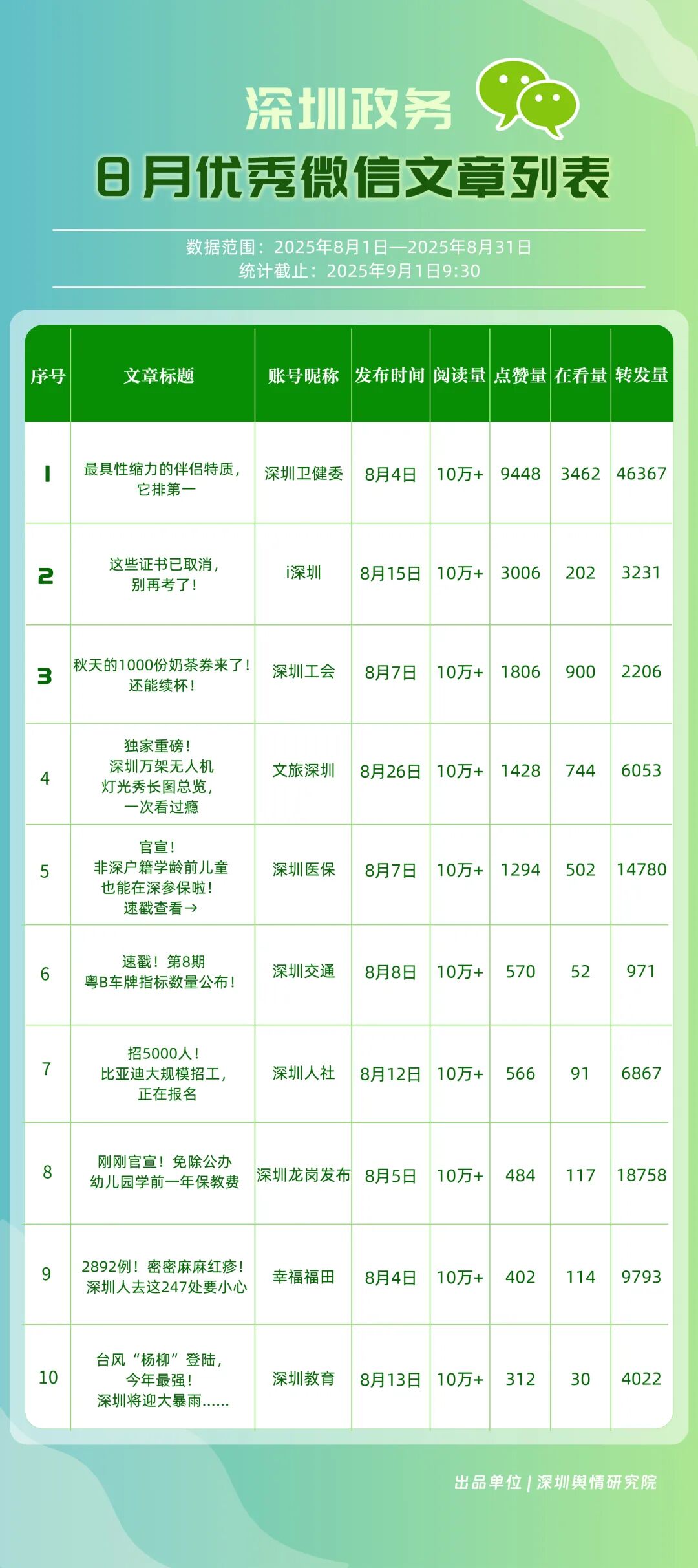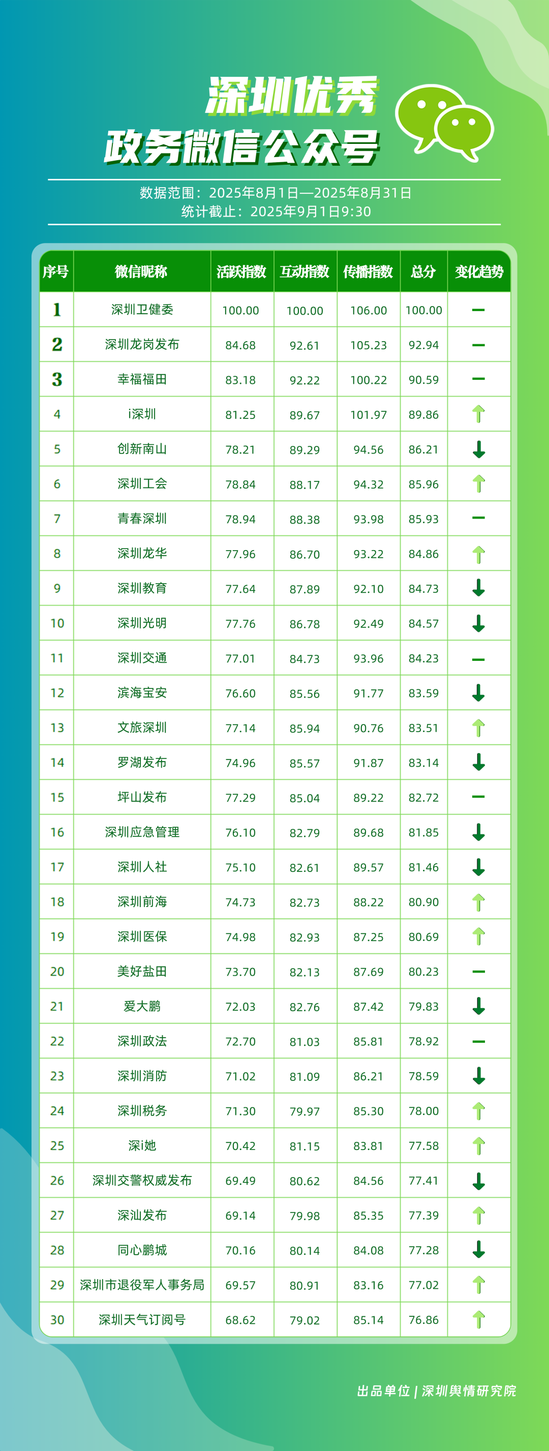 8月(yue),30個(ge)政(zheng)(zheng)務微信(xin)公(gong)眾(zhong)號入(ru)選“深(shen)(shen)(shen)(shen)圳(zhen)優(you)秀政(zheng)(zheng)務微信(xin)公(gong)眾(zhong)號”榜(bang)單,其中包括“深(shen)(shen)(shen)(shen)圳(zhen)衛健(jian)委”“深(shen)(shen)(shen)(shen)圳(zhen)龍(long)(long)崗發布(bu)”“幸福(fu)福(fu)田”“i深(shen)(shen)(shen)(shen)圳(zhen)”“創(chuang)(chuang)新(xin)南山(shan)(shan)”“深(shen)(shen)(shen)(shen)圳(zhen)工(gong)會”“青春(chun)深(shen)(shen)(shen)(shen)圳(zhen)”“深(shen)(shen)(shen)(shen)圳(zhen)龍(long)(long)華”“深(shen)(shen)(shen)(shen)圳(zhen)教(jiao)育(yu)”“深(shen)(shen)(shen)(shen)圳(zhen)光明”等。8月(yue),“深(shen)(shen)(shen)(shen)圳(zhen)衛健(jian)委”66篇推(tui)文獲得超10萬次閱(yue)讀,以(yi)(yi)滿分(fen)位于(yu)榜(bang)單首位;“深(shen)(shen)(shen)(shen)圳(zhen)龍(long)(long)崗發布(bu)”積極傳遞民(min)生信(xin)息(xi),依托區域活動開展宣傳,推(tui)動傳播效果顯著提升,位居第二;“幸福(fu)福(fu)田”關注區域發展動態,排名第三(san)。“i深(shen)(shen)(shen)(shen)圳(zhen)”“創(chuang)(chuang)新(xin)南山(shan)(shan)”“深(shen)(shen)(shen)(shen)圳(zhen)工(gong)會”“青春(chun)深(shen)(shen)(shen)(shen)圳(zhen)”等政(zheng)(zheng)務賬號在(zai)(zai)(zai)信(xin)息(xi)發布(bu)中不(bu)斷提升內(nei)容豐(feng)富性,深(shen)(shen)(shen)(shen)耕優(you)質服務,評分(fen)在(zai)(zai)(zai)85分(fen)以(yi)(yi)上。上榜(bang)微信(xin)公(gong)眾(zhong)號立足自(zi)身特色優(you)勢,以(yi)(yi)精品內(nei)容為核心競爭(zheng)力,在(zai)(zai)(zai)政(zheng)(zheng)務傳播領域樹立了標(biao)桿形(xing)象,成為兼具影響力與公(gong)信(xin)力的示范樣本。