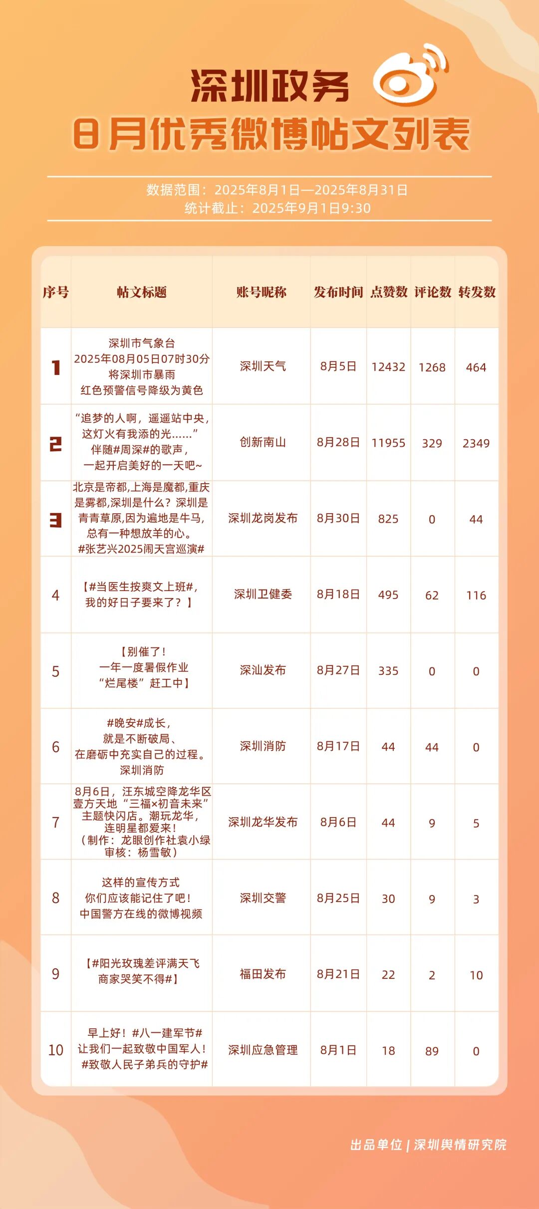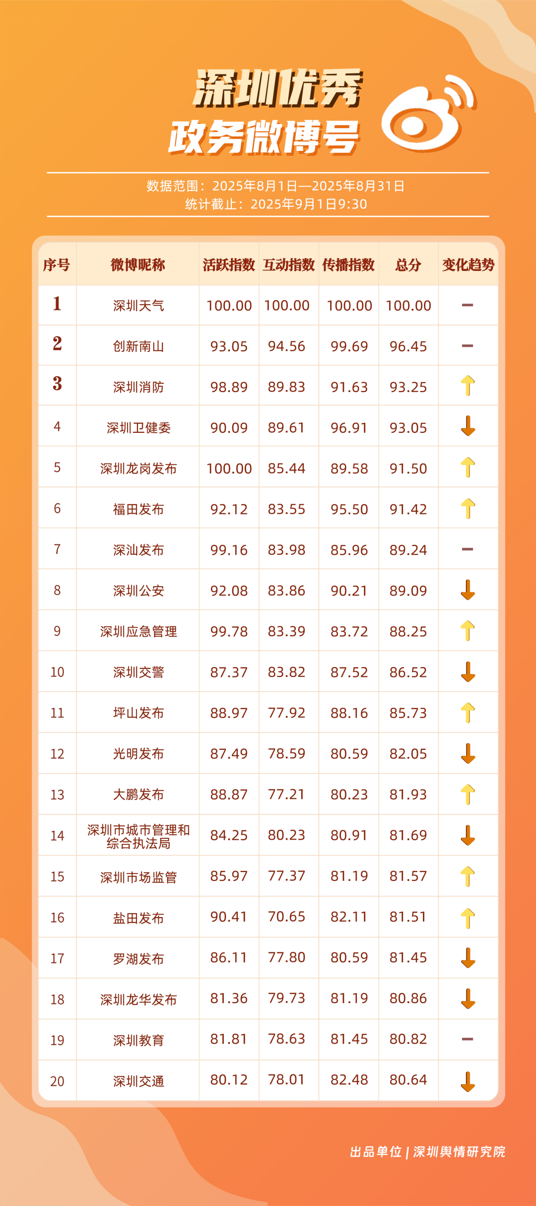 8月,“深(shen)(shen)圳天氣”“創新(xin)南山(shan)(shan)”“深(shen)(shen)圳消(xiao)防”“深(shen)(shen)圳衛健委(wei)”“深(shen)(shen)圳龍(long)崗發(fa)(fa)布”“福(fu)田發(fa)(fa)布”“深(shen)(shen)汕發(fa)(fa)布”“深(shen)(shen)圳公安”“深(shen)(shen)圳應(ying)急管理”“深(shen)(shen)圳交警(jing)”等20個(ge)賬(zhang)號入選“優(you)秀政(zheng)務微(wei)博(bo)號”。其中,“深(shen)(shen)圳天氣”持(chi)續以優(you)質內(nei)容受到(dao)網民(min)肯定,蟬聯榜首(shou);“創新(xin)南山(shan)(shan)”傳播指數得分(fen)再提升,總分(fen)96.45,排名保持(chi)在第二(er)位;“深(shen)(shen)圳消(xiao)防”積極(ji)發(fa)(fa)布消(xiao)防相關內(nei)容,以93.25分(fen)位列第三。上(shang)榜優(you)秀政(zheng)務微(wei)博(bo)賬(zhang)號精準把(ba)握(wo)網民(min)興趣(qu)點,內(nei)容獨(du)具(ju)風采(cai),收獲網民(min)認可(ke),實(shi)現了較好(hao)的傳播效果。